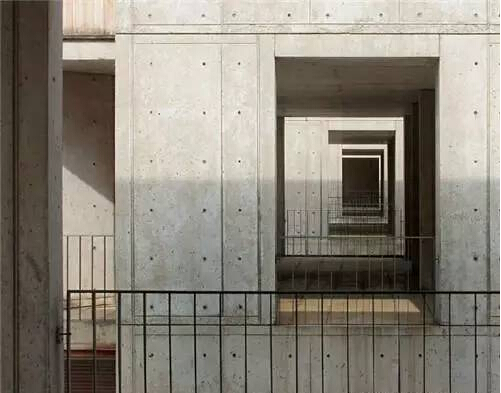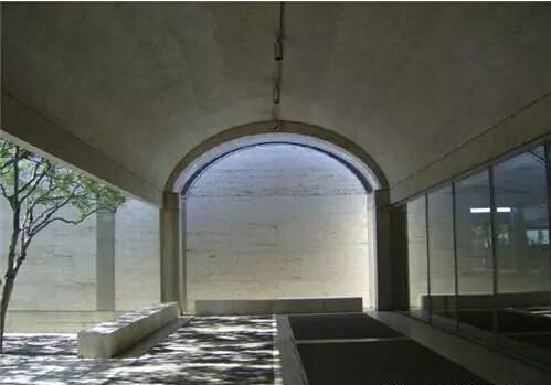 路易 斯?康對混凝土的要求是:貫穿整體的秩序感和通過完整墻面表現(xiàn)出來的美感。金貝爾美術(shù)館位于美國德克薩斯州沃思堡的郊區(qū),于1972年建成??翟诖苏宫F(xiàn)了其個(gè)人對于建筑材料的偏好:將混凝土柱和薄殼形拱頂結(jié)構(gòu)裸露在外,而非承重墻則采用羅馬灰華石及玻璃板,以滿足不同空間和位置的采光要求?;胰A石及玻璃板同混凝土之間沒有過強(qiáng)的對比,所形成的空間質(zhì)感近同,肌理混合為一。