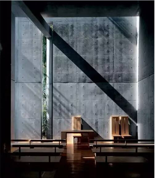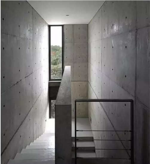 安藤的建筑一般全部或局部采用清水混凝土墻面作為室外或室內(nèi)墻面,這種墻面不加任何裝飾,墻面上的圓孔是殘留的模板螺栓。清水混凝土演奏一曲光與影的旋律。安藤在材料中攙進(jìn)了日本的傳統(tǒng)手藝,利用現(xiàn)代的外墻修補(bǔ)技術(shù),將水泥墻面拆掉模板后進(jìn)行處理,他將混凝土運(yùn)用到了高度精煉的層次。在清水混凝土的施工中,傳統(tǒng)手工藝和現(xiàn)代建筑之間并不矛盾,高超的木模制造工藝、優(yōu)越的混凝土鑄造以及嚴(yán)格的工程管理,共同造就了“安氏混凝土美學(xué)”。