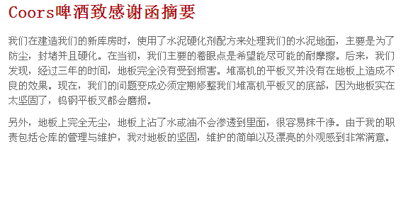 經(jīng)機械竣光后的混凝土地面使用ASHFORD FORMULA–安斯福妙樂3至6個月后會出現(xiàn)打蠟般的光澤,硬度隨時間增長而增加,是原先地坪的2-3倍。無需打蠟,為您節(jié)約大量的維護費用。