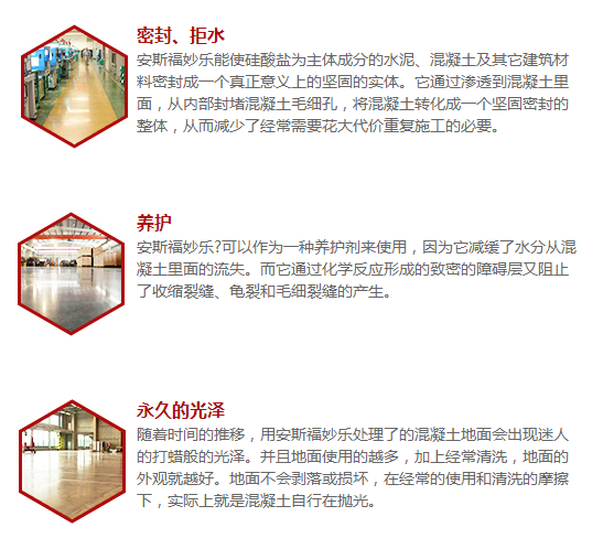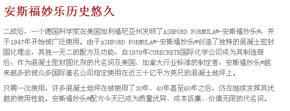 來自美國的ASHFORD FORMULA–安斯福妙樂混凝土密封固化劑,是一種無色、無味、無毒的液體密封劑,通過有效滲透(5-8mm),ASHFORD FORMULA–安斯福妙樂與混凝土中的化學成分發(fā)生深刻化學反應,使其成分固化成一個堅實固體,從而得到一個無塵、致密的整體,有效的提高了密度、強度、耐磨性。因此安斯福妙樂混凝土密封固化劑又被叫做水泥地面硬化劑,混凝土液體固化劑,滲透密封劑,滲透硬化劑,地面起砂處理劑等等。