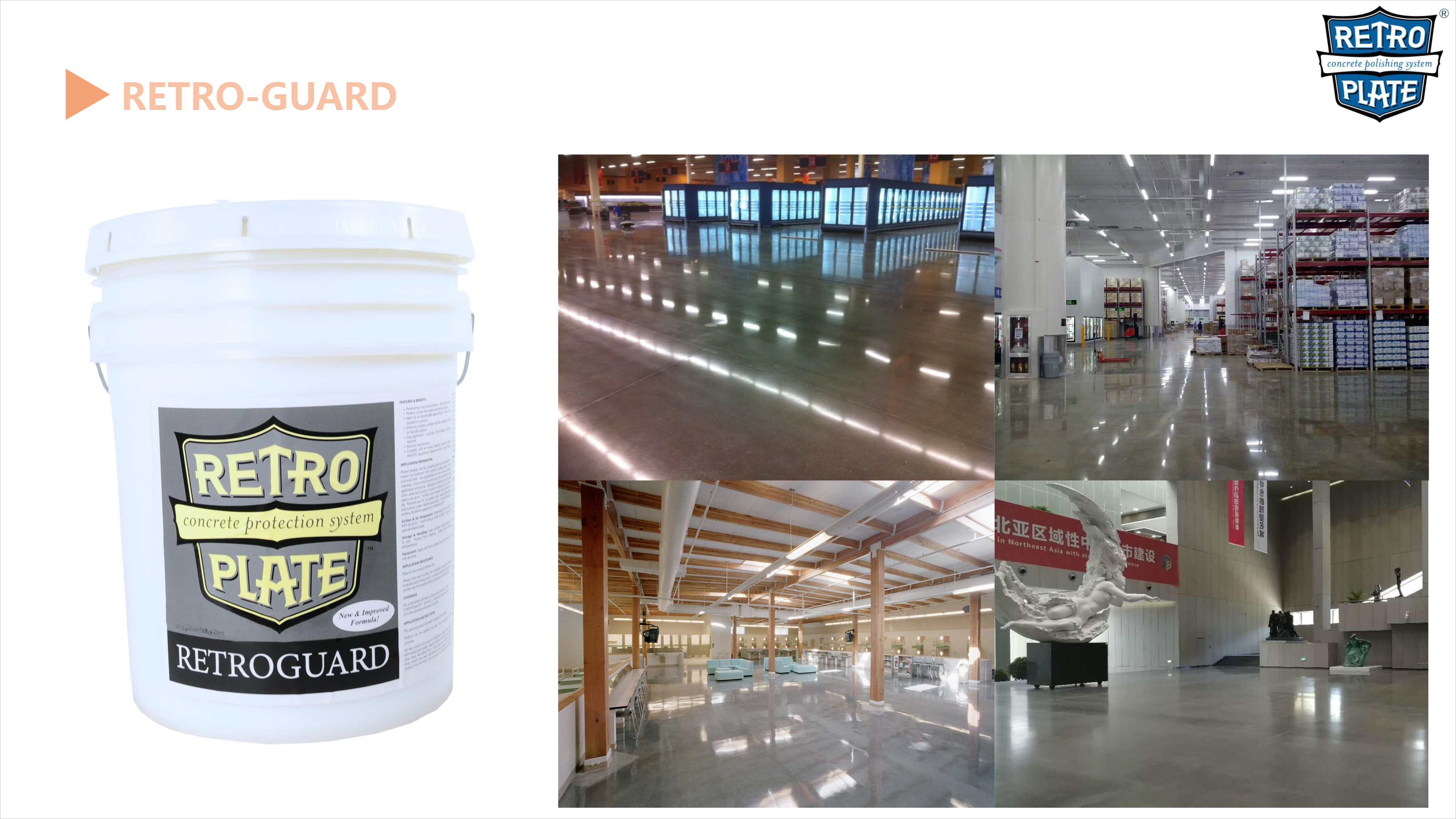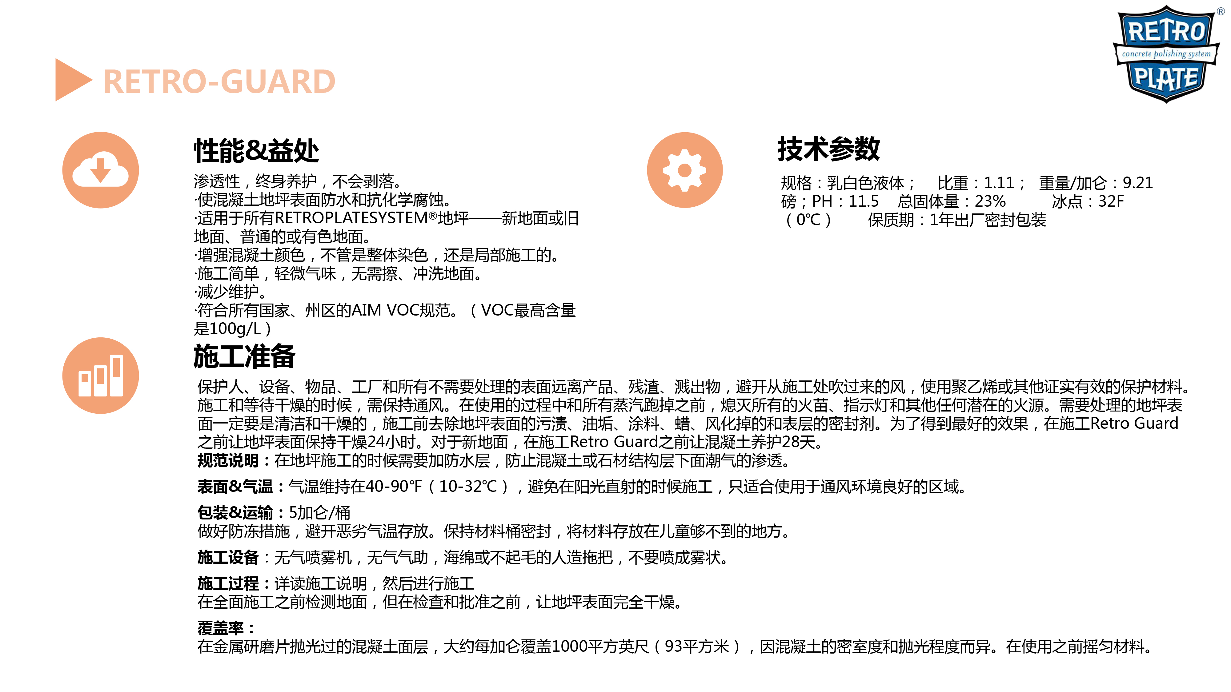 RetroGuard是一種水基共聚物,是硅酸鹽和聚合物的化合作用。當聚合物密封混凝土的同時,硅酸鹽硬化混凝土形成一個外表美觀、易于維護保養(yǎng)的地面。RetroGuard處理過的地坪表面能防水、防化學(xué)侵蝕和耐磨,RetroGuard是高質(zhì)RetroPlate地坪的很后一道工序。