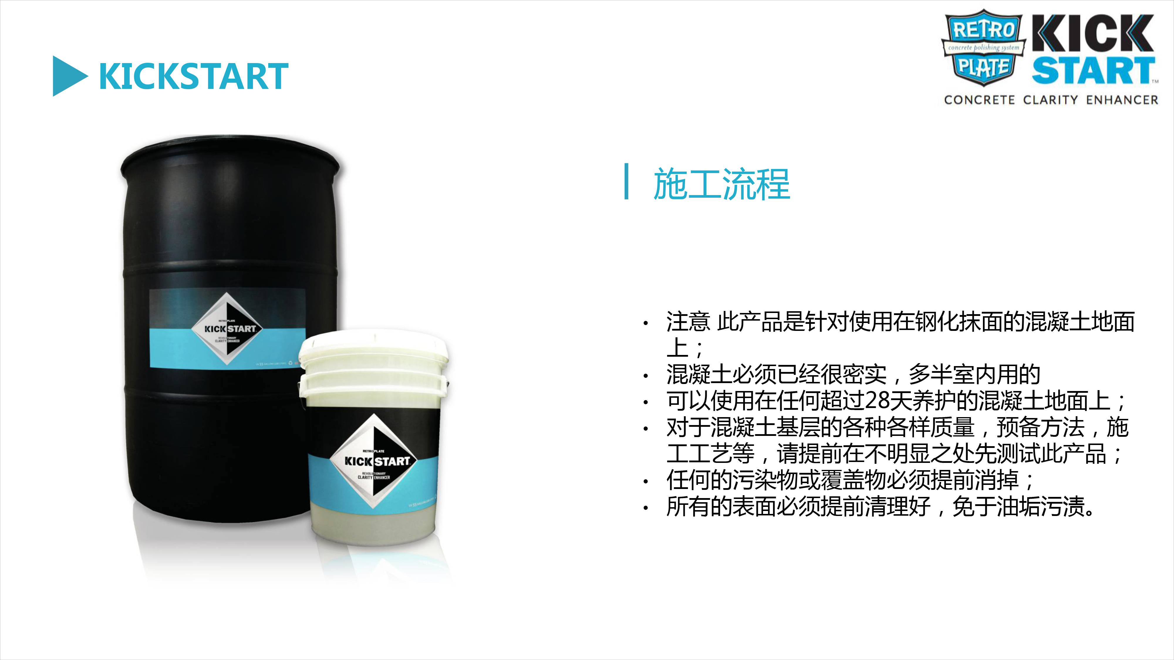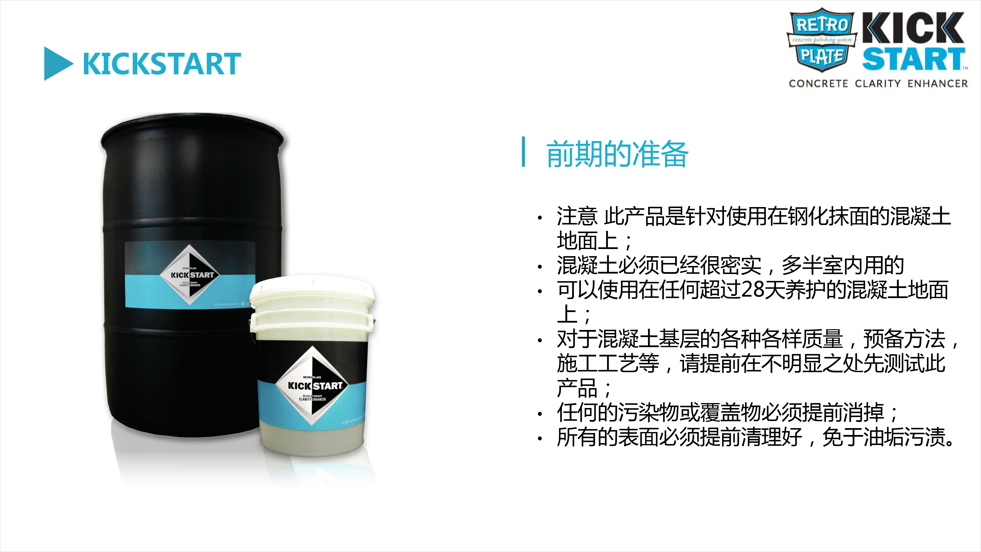 在施工KickStart之前去除所有膜狀化合物或涂料固化劑等。