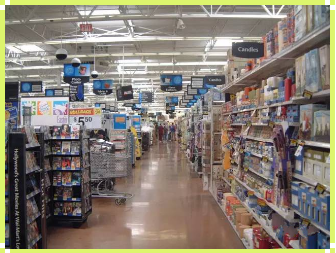 沃爾瑪超級(jí)市場(chǎng)比一般的超級(jí)市場(chǎng)面積略大一些,每家平均約占地45000平方尺,經(jīng)營(yíng)的商品品種齊全。但凡一個(gè)家庭所需要的物品在這里都能買到,又稱“家庭一次購(gòu)物”。從服飾、布匹、藥品、玩具、各種生活用品、家用電器、珠寶化妝品,到汽車配件、小型游艇等等,一應(yīng)俱全。