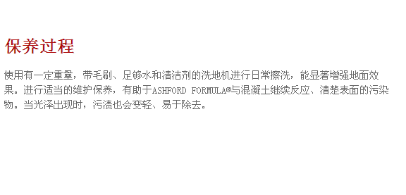 經(jīng)機械竣光后的混凝土地面使用ASHFORD FORMULA–安斯福妙樂3至6個月后會出現(xiàn)打蠟般的光澤,硬度隨時間增長而增加,是原先地坪的2-3倍。無需打蠟,為您節(jié)約大量的維護費用。