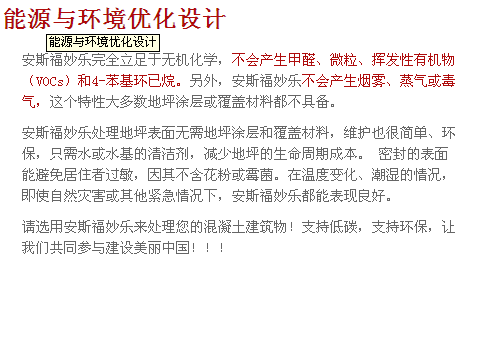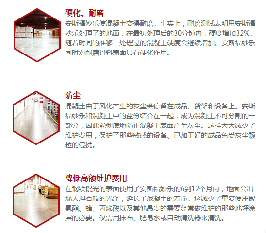 來自美國的ASHFORD FORMULA–安斯福妙樂混凝土密封固化劑,是一種無色、無味、無毒的液體密封劑,通過有效滲透(5-8mm),ASHFORD FORMULA–安斯福妙樂與混凝土中的化學成分發(fā)生深刻化學反應,使其成分固化成一個堅實固體,從而得到一個無塵、致密的整體,有效的提高了密度、強度、耐磨性。因此安斯福妙樂混凝土密封固化劑又被叫做水泥地面硬化劑,混凝土液體固化劑,滲透密封劑,滲透硬化劑,地面起砂處理劑等等。