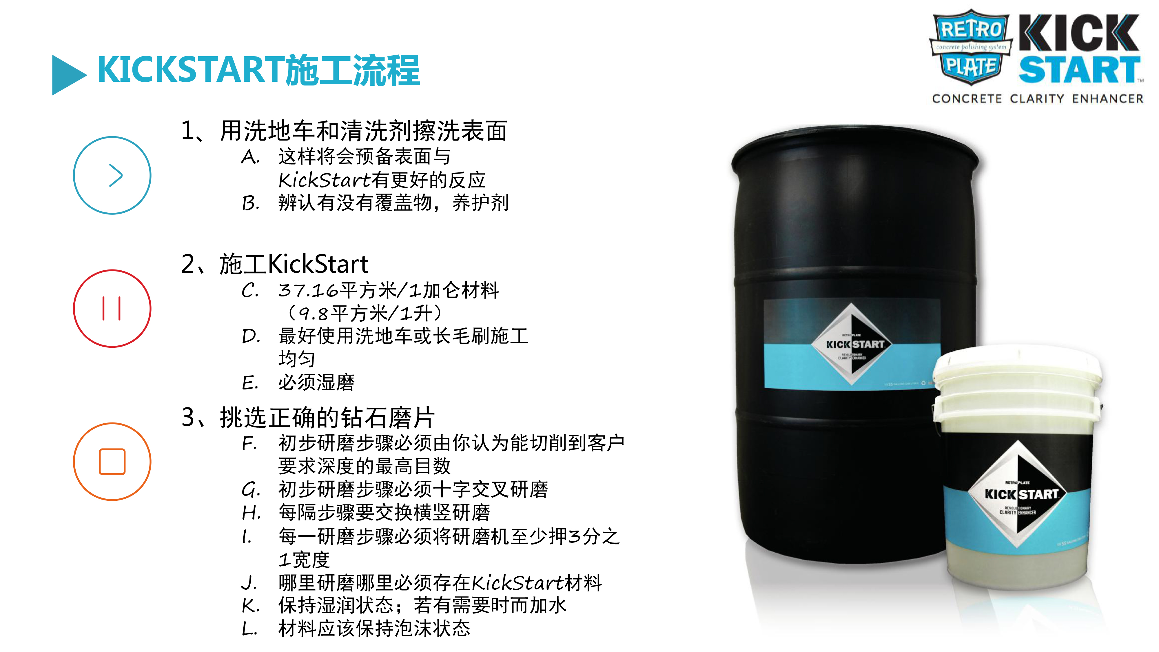 1、在施工之前,使用creteclean將地面進(jìn)行清洗,這一步驟有利于KickStart材料吸收。它也可以確定面層是否沒(méi)有任何的覆蓋層,固化劑,或防粘結(jié)材料的存在以阻擋液體材料得吸收。